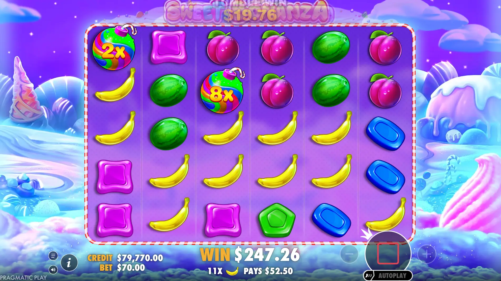 Land 4 or more lollipop scatter symbols and you will get 10 free spins. The bonus round is the place where the big wins take place. Multiplier bombs ranging from 2x to 100x appear in the bonus round. If you land more scatters during the bonus round, you will get extra free spins.